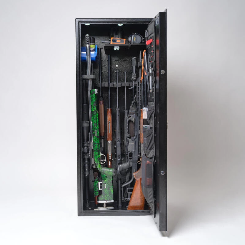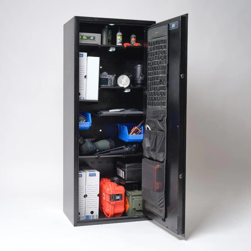 Cette armoire est modulable à l’infini : les 108 crochets présents sur le fond de l’armoire, et les 22 crochets sur chaque côté vous permettrons d’obtenir la configuration unique qui vous convient, avec ou sans armes. La mise en place des accessoires ne nécessite pas d’outils. L’offre d’accessoires est composée actuellement d’une tablette supportant jusqu’à 20kg, d’une boite de type atelier, de supports pour armes. D’autres accessoires arriveront dans un avenir proche.